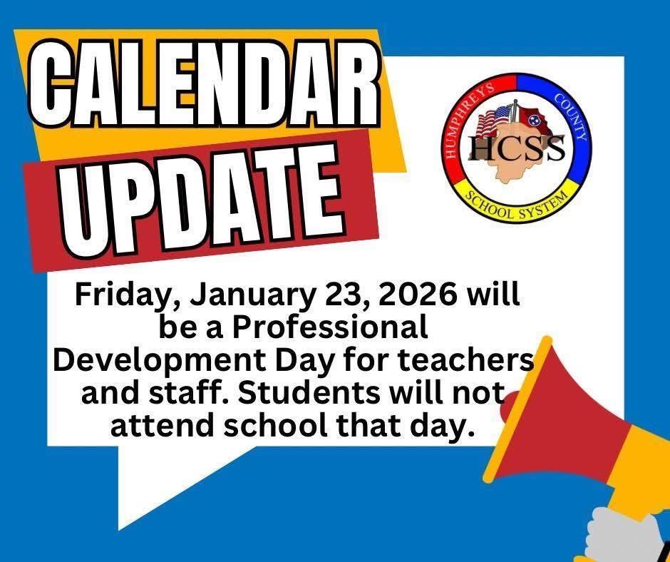 Humphreys County Schools will utilize Friday, January 23, 2026 as a Professional Development Day for teachers and staff. Students will not attend school that day.